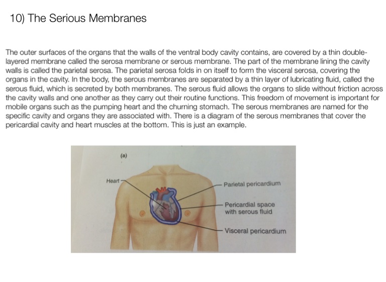 The outer surfaces of the organs that the walls of the ventral body cavity contains, are covered by a thin double-layered membrane called the serosa membrane or serous membrane. The part of the membrane lining the cavity walls is called the parietal serosa. The parietal serosa folds in on itself to form the visceral serosa, covering the organs in the cavity. In the body, the serous membranes are separated by a thin layer of lubricating fluid, called the serous fluid, which is secreted by both membranes. The serous fluid allows the organs to slide without friction across the cavity walls and one another as they carry out their routine functions. This freedom of movement is important for mobile organs such as the pumping heart and the churning stomach. The serous membranes are named for the specific cavity and organs they are associated with. There is a diagram of the serous membranes that cover the pericardial cavity and heart muscles at the bottom. This is just an example.