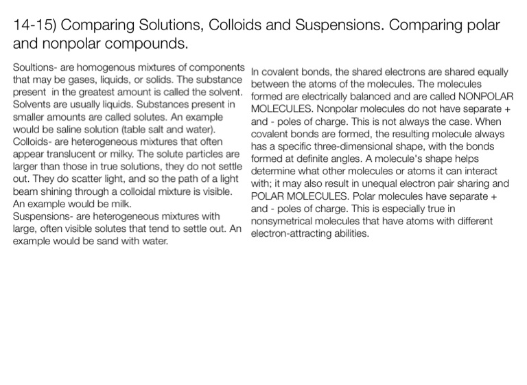 14-15) Comparing Solutions, Colloids and Suspensions. Comparing polar and nonpolar compounds.