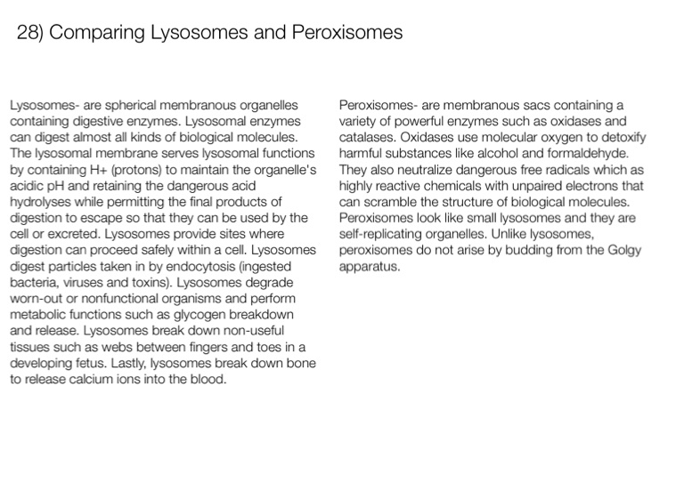 Peroxisomes- are membranous sacs containing a variety of powerful enzymes such as oxidases and catalases. Oxidases use molecular oxygen to detoxify harmful substances like alcohol and formaldehyde. They also neutralize dangerous free radicals which as highly reactive chemicals with unpaired electrons that can scramble the structure of biological molecules. Peroxisomes look like small lysosomes and they are self-replicating organelles. Unlike lysosomes, peroxisomes do not arise by budding from the Golgy apparatus.