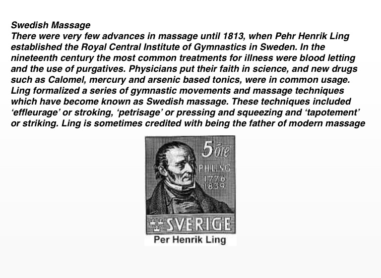 There were very few advances in massage until 1813, when Pehr Henrik Ling established the Royal Central Institute of Gymnastics in Sweden. In the nineteenth century the most common treatments for illness were blood letting and the use of purgatives. Physicians put their faith in science, and new drugs such as Calomel, mercury and arsenic based tonics, were in common usage. Ling formalized a series of gymnastic movements and massage techniques which have become known as Swedish massage. These techniques included ‘effleurage’ or stroking, ‘petrisage’ or pressing and squeezing and ‘tapotement’ or striking. Ling is sometimes credited with being the father of modern massage