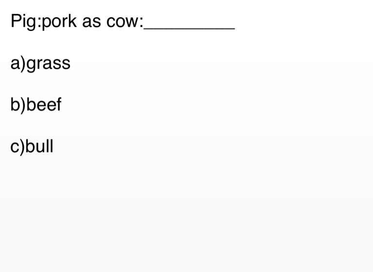 Pig:pork as cow:_________ a)grass b)beef c)bull