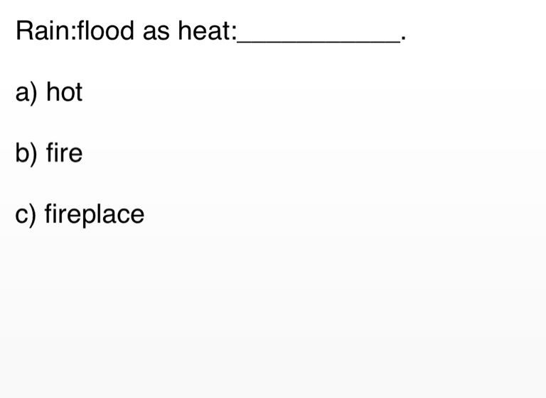 Rain:flood as heat:___________. a) hot b) fire c) fireplace