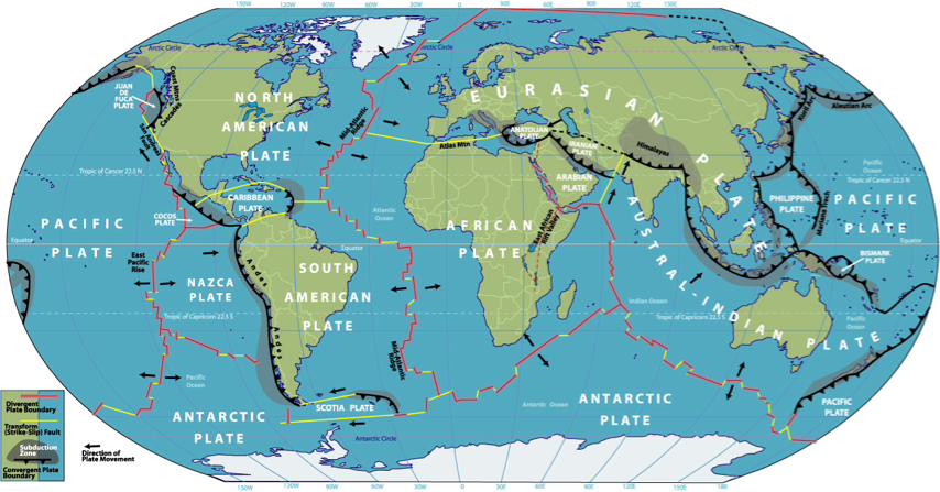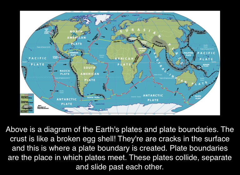 Above is a diagram of the Earth's plates and plate boundaries. The crust is like a broken egg shell! They're are cracks in the surface and this is where a plate boundary is created. Plate boundaries are the place in which plates meet. These plates collide, separate and slide past each other.