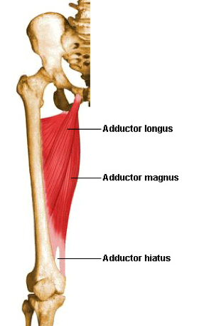On the medial side of the thigh, the adductor magnus muscle takes the form of a large triangle. As an adductor, it contracts and pulls the hip towards the body's midline. This action is a fundamental part of walking, sprinting and a host of other bipedal motions. The muscle also extends the hip.