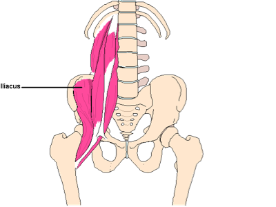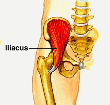 flat triangular muscle found in the pelvic area. the iliacus is important for lifting (flexing) the femur forward & bends the trunk forward and can lift the trunk from a lying posture.