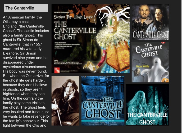 An American family, the Otis, buy a castle in England, “the Canterville Chase”. The castle includes also a family ghost. This ghost is Sir Simon de Canterville, that in 1557 murdered his wife Lady Eleanore. Sir Simon survived nine years and he disappeared under mysterious circumstances. His body was never found. But when the Otis arrive, for the ghost life gets harder, because they don’t believe in ghosts, so they aren’t frightened when they see him. On the contrary the family play some tricks to the ghost. The ghost feels very insulted and furious, so he wants to take revenge for the family’s behaviour. This fight between the Otis and Sir Simon results in comic and sad situations.