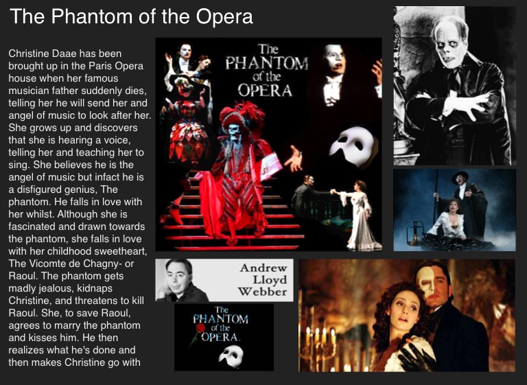 Christine Daae has been brought up in the Paris Opera house when her famous musician father suddenly dies, telling her he will send her and angel of music to look after her. She grows up and discovers that she is hearing a voice, telling her and teaching her to sing. She believes he is the angel of music but infact he is a disfigured genius, The phantom. He falls in love with her whilst. Although she is fascinated and drawn towards the phantom, she falls in love with her childhood sweetheart, The Vicomte de Chagny- or Raoul. The phantom gets madly jealous, kidnaps Christine, and threatens to kill Raoul. She, to save Raoul, agrees to marry the phantom and kisses him. He then realizes what he's done and then makes Christine go with Raoul, disappearing forever.