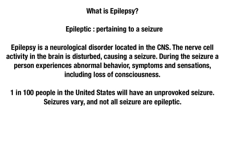 Epilepsy is a neurological disorder located in the CNS. The nerve cell activity in the brain is disturbed, causing a seizure. During the seizure a person experiences abnormal behavior, symptoms and sensations, including loss of consciousness.