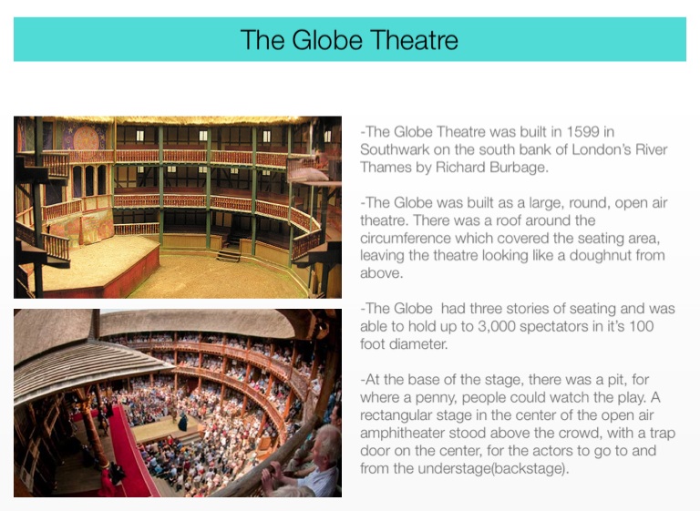 -The Globe was built as a large, round, open air theatre. There was a roof around the circumference which covered the seating area, leaving the theatre looking like a doughnut from above.