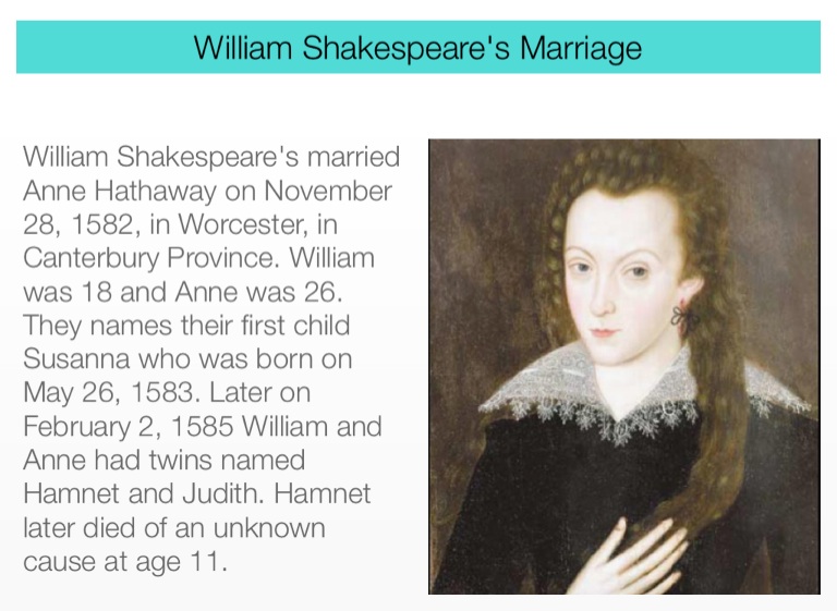 William Shakespeare's married Anne Hathaway on November 28, 1582, in Worcester, in Canterbury Province. William was 18 and Anne was 26. They names their first child Susanna who was born on May 26, 1583. Later on February 2, 1585 William and Anne had twins named Hamnet and Judith. Hamnet later died of an unknown cause at age 11.