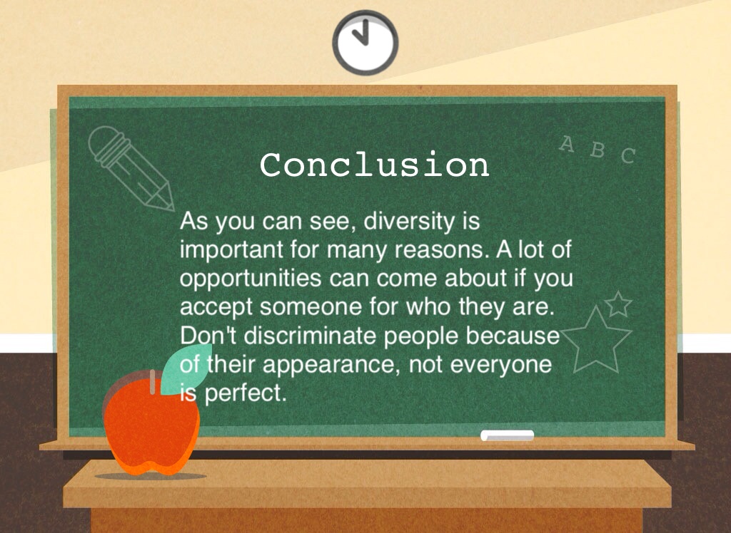As you can see, diversity is important for many reasons. A lot of opportunities can come about if you accept someone for who they are. Don't discriminate people because of their appearance, not everyone is perfect.