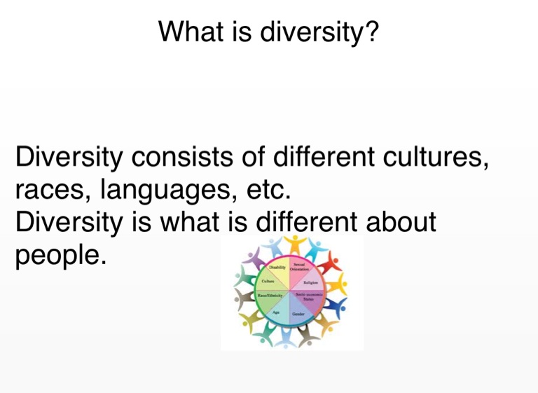 Diversity consists of different cultures, races, languages, etc.