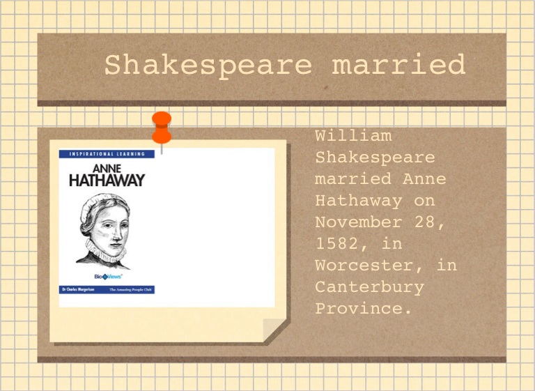 William Shakespeare married Anne Hathaway on November 28, 1582, in Worcester, in Canterbury Province.