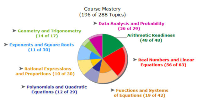 Progress in ALEKS is measured by a pie chart that reflects the number of topics in your math course and how many steps remain towards achieving mastery