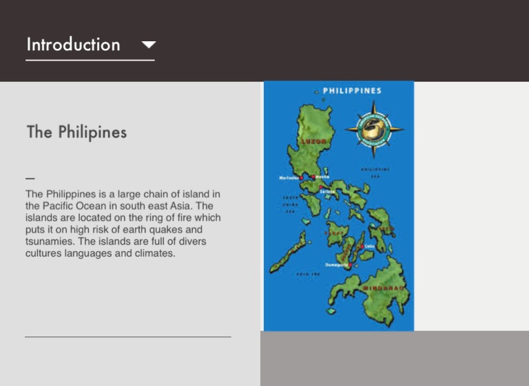 The Philippines is a large chain of island in the Pacific Ocean in south east Asia. The islands are located on the ring of fire which puts it on high risk of earth quakes and tsunamies. The islands are full of divers cultures languages and climates.