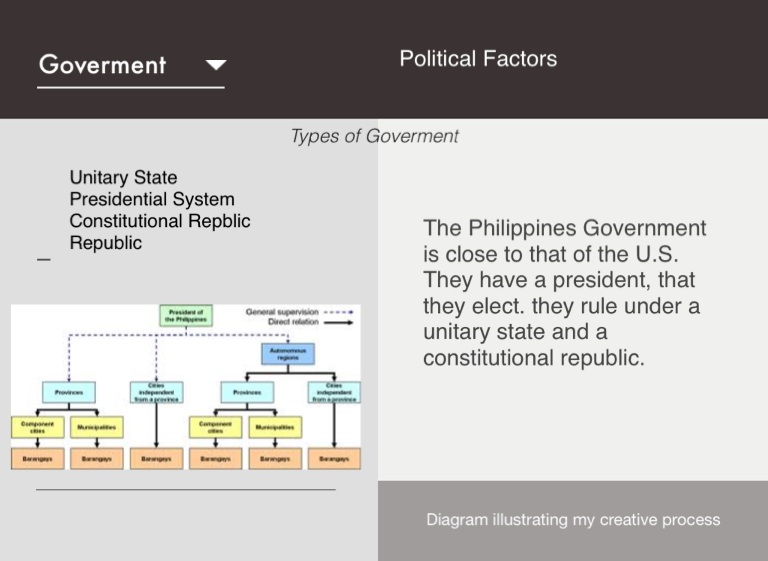 The Philippines Government is close to that of the U.S. They have a president, that they elect. they rule under a unitary state and a constitutional republic.