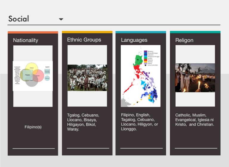 Tgalog, Cebuano, Llocano, Bisaya, Hiligayon, Bikol, Waray.