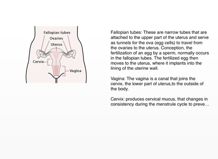 Fallopian tubes: These are narrow tubes that are attached to the upper part of the uterus and serve as tunnels for the ova (egg cells) to travel from the ovaries to the uterus. Conception, the fertilization of an egg by a sperm, normally occurs in the fallopian tubes. The fertilized egg then moves to the uterus, where it implants into the lining of the uterine wall.