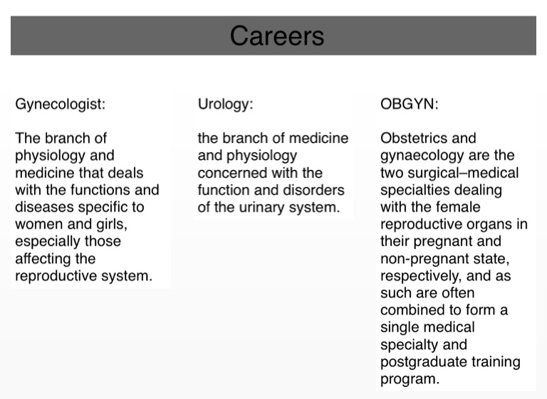 Obstetrics and gynaecology are the two surgical–medical specialties dealing with the female reproductive organs in their pregnant and non-pregnant state, respectively, and as such are often combined to form a single medical specialty and postgraduate training program.