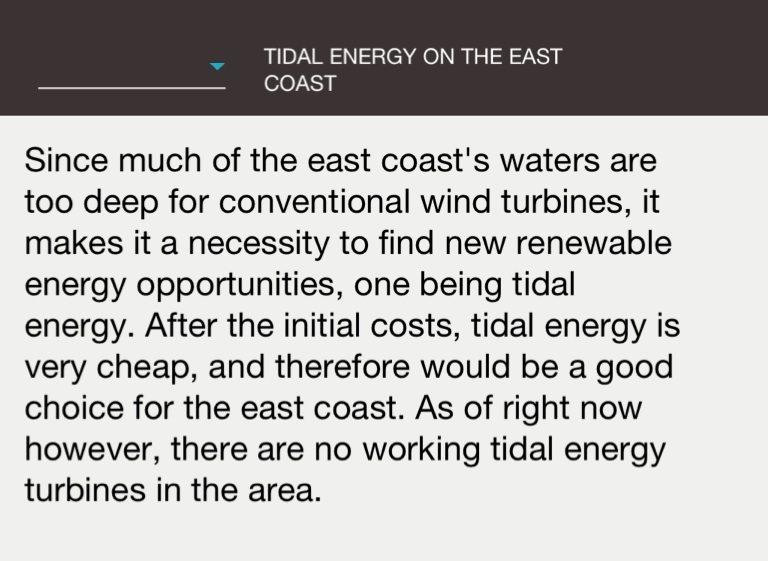 Since much of the east coast's waters are too deep for conventional wind turbines, it makes it a necessity to find new renewable energy opportunities, one being tidal energy. After the initial costs, tidal energy is very cheap, and therefore would be a good choice for the east coast. As of right now however, there are no working tidal energy turbines in the area.