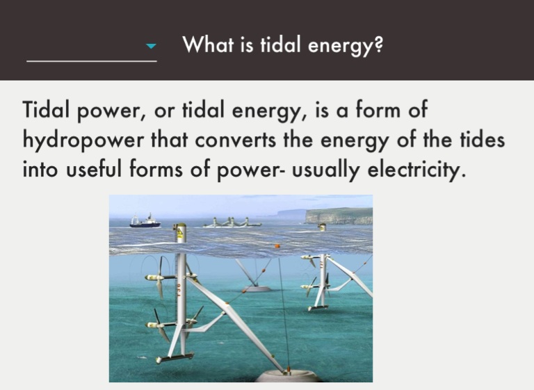 Tidal power, or tidal energy, is a form of hydropower that converts the energy of the tides into useful forms of power- usually electricity.