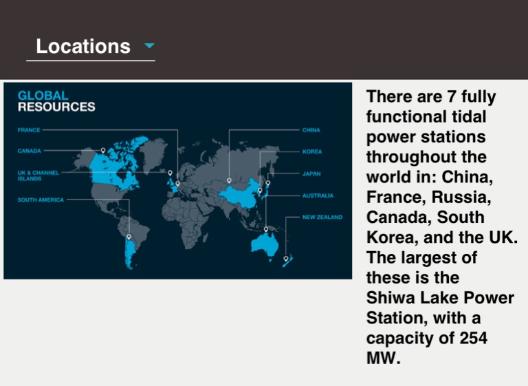There are 7 fully functional tidal power stations throughout the world in: China, France, Russia, Canada, South Korea, and the UK. The largest of these is the