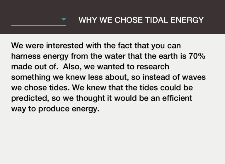 We were interested with the fact that you can harness energy from the water that the earth is 70% made out of. Also, we wanted to research something we knew less about, so instead of waves we chose tides. We knew that the tides could be predicted, so we thought it would be an efficient way to produce energy.