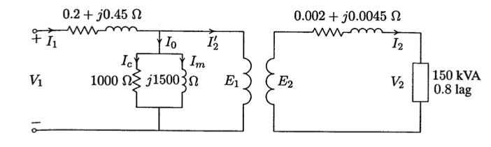 A 150- kVA, 2400/240 - V single-phase transformer has the parameters in the figure shown. Determine the equivalent circuit referred at the high-voltage side.