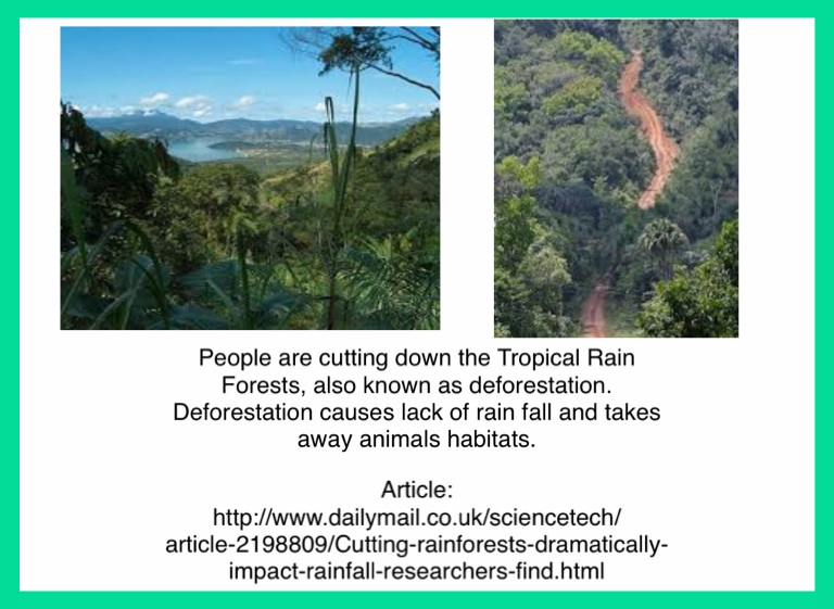 People are cutting down the Tropical Rain Forests, also known as deforestation. Deforestation causes lack of rain fall and takes away animals habitats.