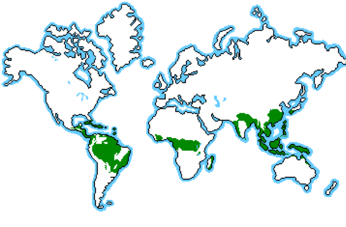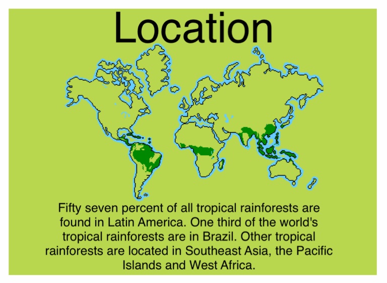 Fifty seven percent of all tropical rainforests are found in Latin America. One third of the world's tropical rainforests are in Brazil. Other tropical rainforests are located in Southeast Asia, the Pacific Islands and West Africa.