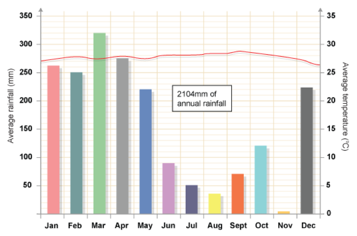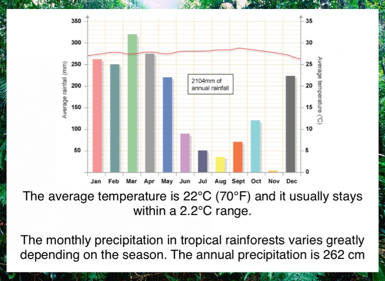 The monthly precipitation in tropical rainforests varies greatly depending on the season. The annual precipitation is 262 cm