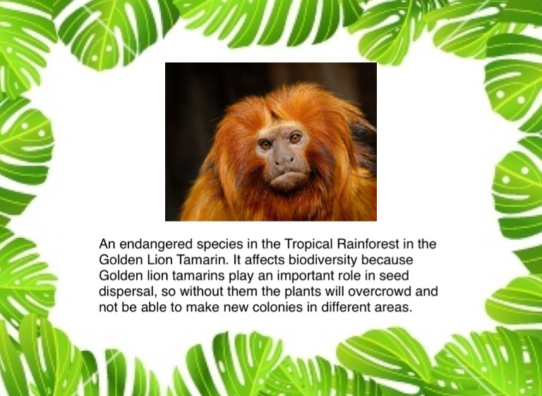 An endangered species in the Tropical Rainforest in the Golden Lion Tamarin. It affects biodiversity because Golden lion tamarins play an important role in seed dispersal, so without them the plants will overcrowd and not be able to make new colonies in different areas.