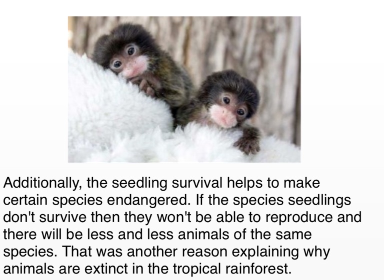 Additionally, the seedling survival helps to make certain species endangered. If the species seedlings don't survive then they won't be able to reproduce and there will be less and less animals of the same species. That was another reason explaining why animals are extinct in the tropical rainforest.