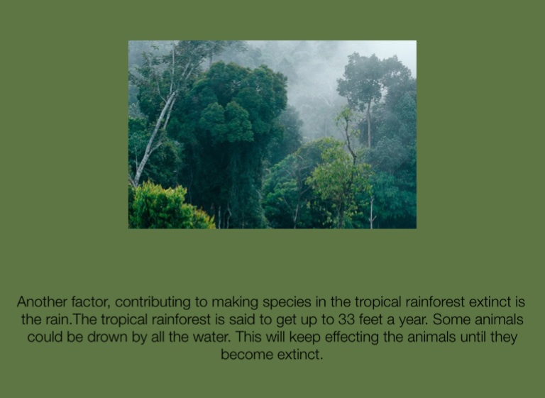Another factor, contributing to making species in the tropical rainforest extinct is the rain.The tropical rainforest is said to get up to 33 feet a year. Some animals could be drown by all the water. This will keep effecting the animals until they become extinct.