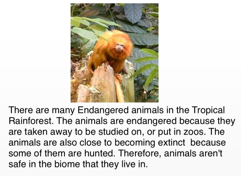 There are many Endangered animals in the Tropical Rainforest. The animals are endangered because they are taken away to be studied on, or put in zoos. The animals are also close to becoming extinct because some of them are hunted. Therefore, animals aren't safe in the biome that they live in.