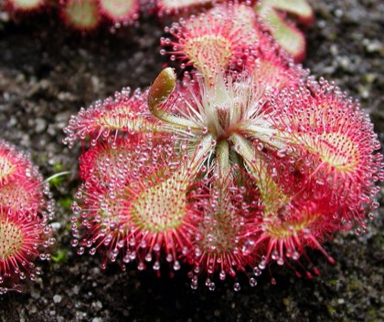Responds to Stimuli: the sundew plant responds to the sun by turning red when it's under the sun for too long.
