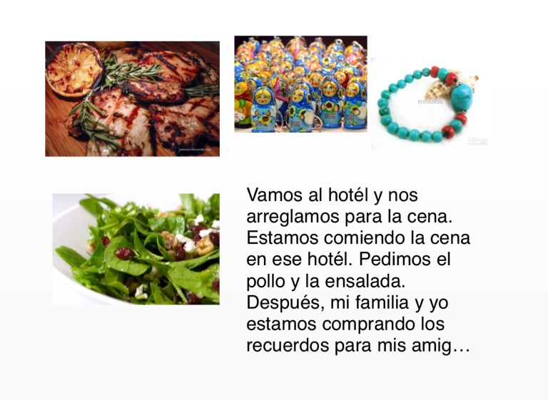 Vamos al hotél y nos arreglamos para la cena. Estamos comiendo la cena en ese hotél. Pedimos el pollo y la ensalada. Después, mi familia y yo estamos comprando los recuerdos para mis amigos.
