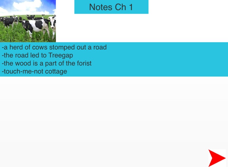 -a herd of cows stomped out a road -the road led to Treegap -the wood is a part of the forist -touch-me-not cottage