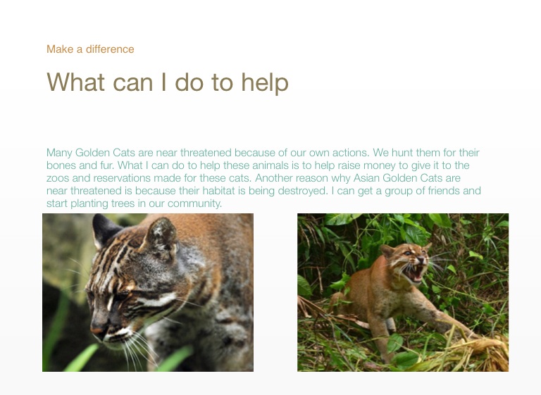 Many Golden Cats are near threatened because of our own actions. We hunt them for their bones and fur. What I can do to help these animals is to help raise money to give it to the zoos and reservations made for these cats. Another reason why Asian Golden Cats are near threatened is because their habitat is being destroyed. I can get a group of friends and start planting trees in our community.