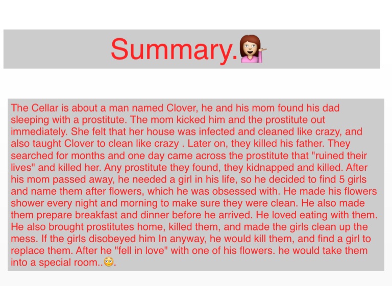 The Cellar is about a man named Clover, he and his mom found his dad sleeping with a prostitute. The mom kicked him and the prostitute out immediately. She felt that her house was infected and cleaned like crazy, and also taught Clover to clean like crazy . Later on, they killed his father. They searched for months and one day came across the prostitute that "ruined their lives" and killed her. Any prostitute they found, they kidnapped and killed. After his mom passed away, he needed a girl in his life, so he decided to find 5 girls and name them after flowers, which he was obsessed with. He made his flowers shower every night and morning to make sure they were clean. He also made them prepare breakfast and dinner before he arrived. He loved eating with them. He also brought prostitutes home, killed them, and made the girls clean up the mess. If the girls disobeyed him In anyway, he would kill them, and find a girl to replace them. After he "fell in love" with one of his flowers. he would take them into a special room..😳.
