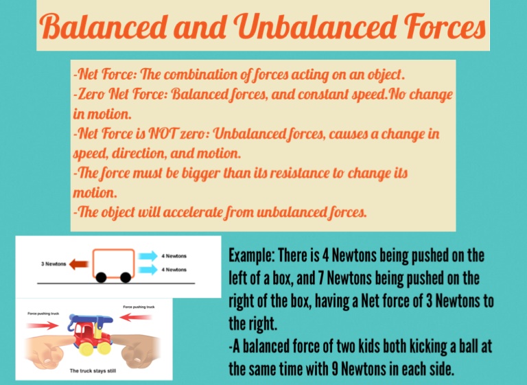 -Net Force is NOT zero: Unbalanced forces, causes a change in speed, direction, and motion.
