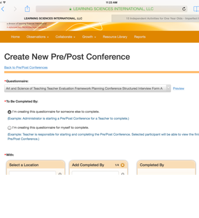Within this drop down, your administrator will create a new conference. You have access to three forms. The first two may be used in planning your observation, and could be utilized for a pre-conference with your administrator. You can also create the form for yourself.
