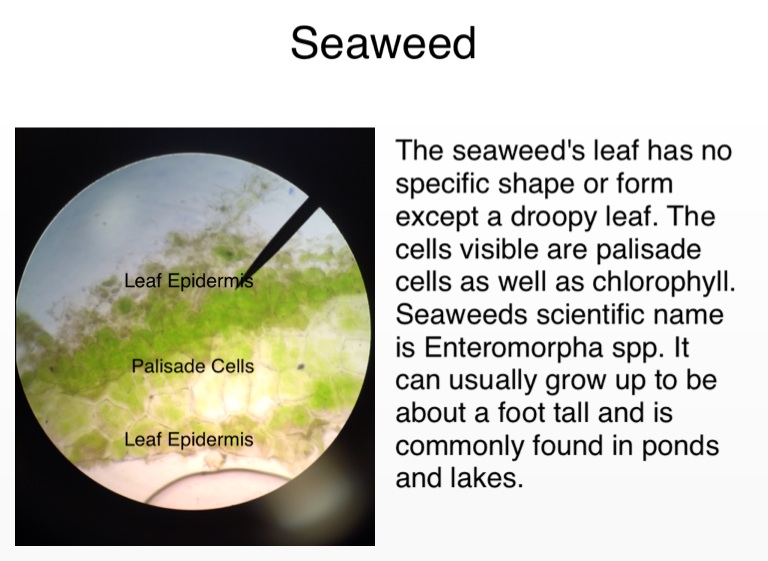The seaweed's leaf has no specific shape or form except a droopy leaf. The cells visible are palisade cells as well as chlorophyll. Seaweeds scientific name is Enteromorpha spp. It can usually grow up to be about a foot tall and is commonly found in ponds and lakes.