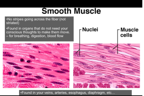 The smooth muscle is is attached to multiple hair follicles. This is one of the things that could cause goose bumps. It is located in the walls of hollow organs, such as blood vessels. The smooth muscle is involuntary. Finally there are no stripes going across the fiber, therefore it in non- striated.