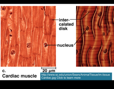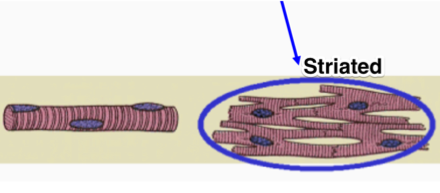 The first type of muscle tissue is the cardiac muscle.The cardiac muscle has stripes going across the fiber. Therefore it's is striated. The cardiac muscle is involuntary. Involuntary means that you don't have to think about it. One example of a cardiac muscle would be the heart.