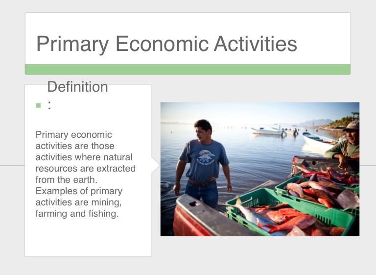 Primary economic activities are those activities where natural resources are extracted from the earth. Examples of primary activities are mining, farming and fishing.