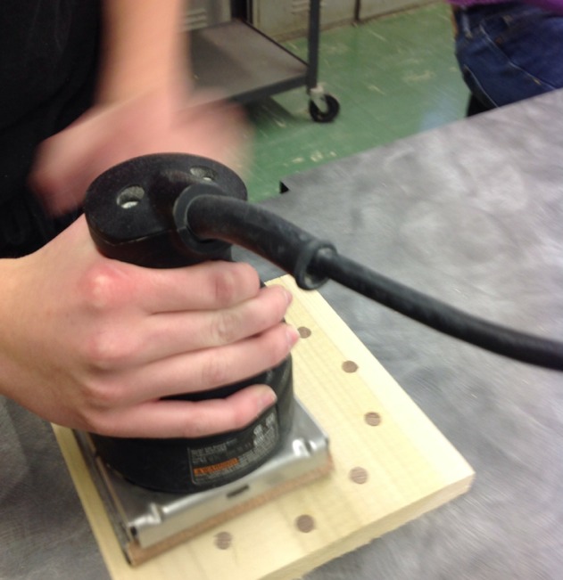 After it's dry chizzle out the extra wood sticking out. Then you will use a sander and sand the piece to make it all flat make sure to move in the direction of the grain in the wood. After that go and drill 4 holes on the other side of your face piece and after that make a small square in the back so that we can put batteries in. Before doing that make sure you drilled a hole in the middle all the way through. And in the sand the face piece again this time all the sides.