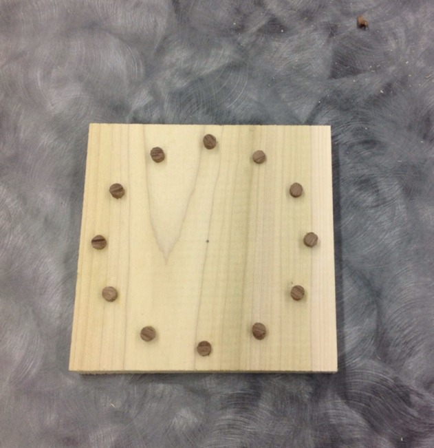Now we move onto the face of the clock. First you take a metal outline and you put it on top of your face piece. Then you take your pencil and trace a little circle with your pencil to make the center dot and dots around. Then u take a little needle like tool and match up the needle and hit the top to make a tiny hole. After that you go back to the drill press and drill holes half way into the face all the way around but make sure not to do the middle hole. Then dig out 12 pieces of brown wood and put glue in the holes and put the brown pieces of wood in them. Push them in do not pound. Wait for it to dry.
