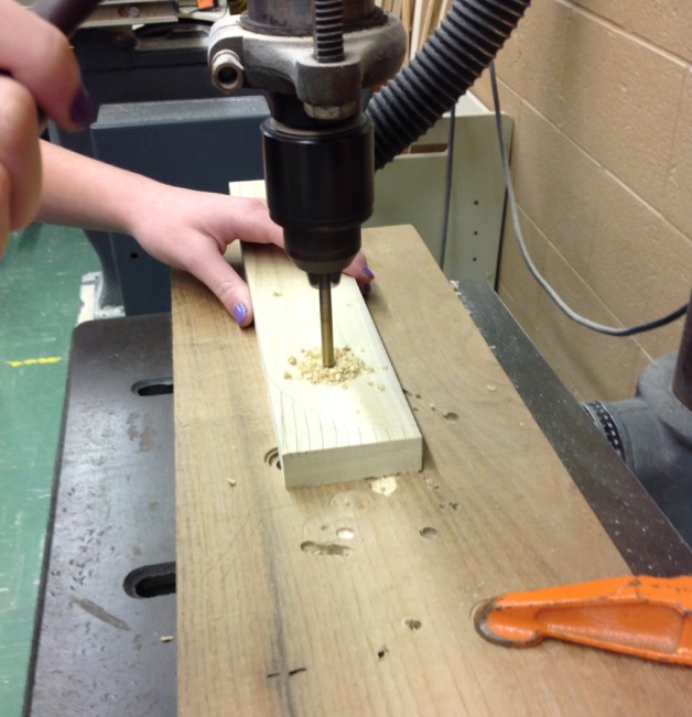 After that take your wood to the drill press and measure your small hole up to the bit and slowly spin the side handle. After drilling a little bit into your wood, release and drill in again release and do it again and again until the bit goes all the way through your piece of wood.