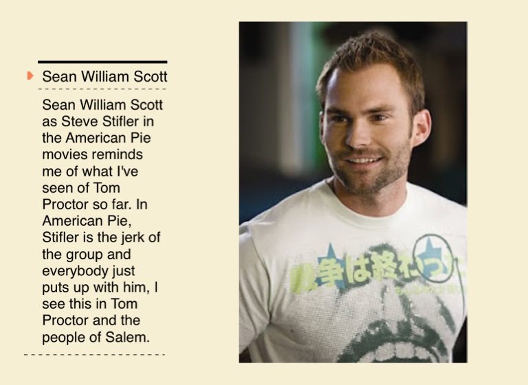 Sean William Scott as Steve Stifler in the American Pie movies reminds me of what I've seen of John Proctor so far. In American Pie, Stifler is the jerk of the group and everybody just puts up with him, I see this in John Proctor and the people of Salem.